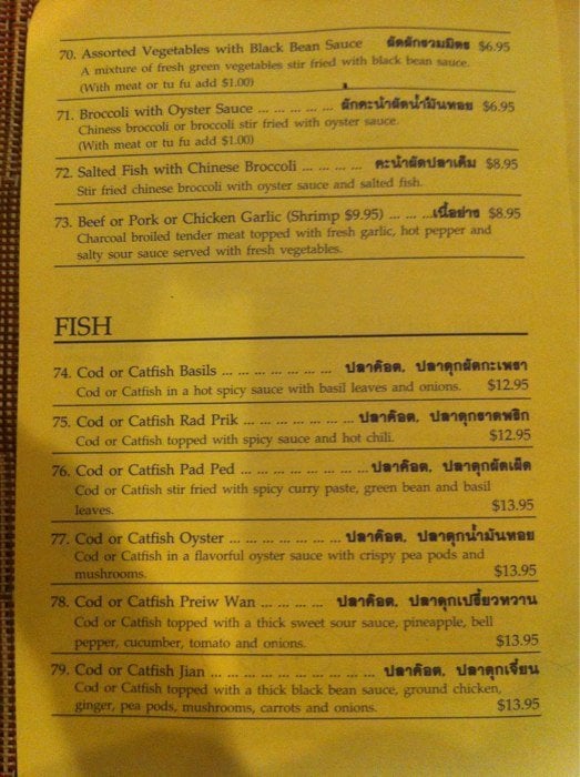 Cod or catfish in a flavorful oyster sauce with crispy pea pods and mushrooms.