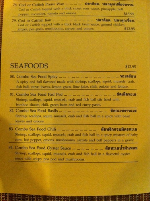 Shrimp, scallops, squid, mussels, crab and fish ball stir fried with bamboo shoots, chili, green bean and red curry paste.